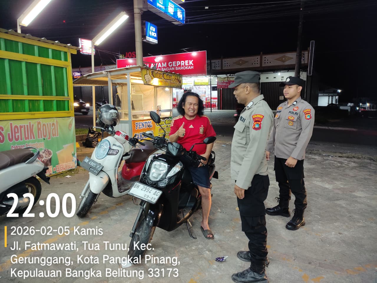 PANGKALPINANG — Personel Polsek Gerunggang melaksanakan patroli dialogis di wilayah hukumnya guna meningkatkan keamanan dan ketertiban masyarakat, khususnya dalam mencegah tindak kriminalitas pencurian kendaraan bermotor. Dalam kegiatan tersebut, petugas menyasar sejumlah titik keramaian dan area parkir kendaraan milik warga.
