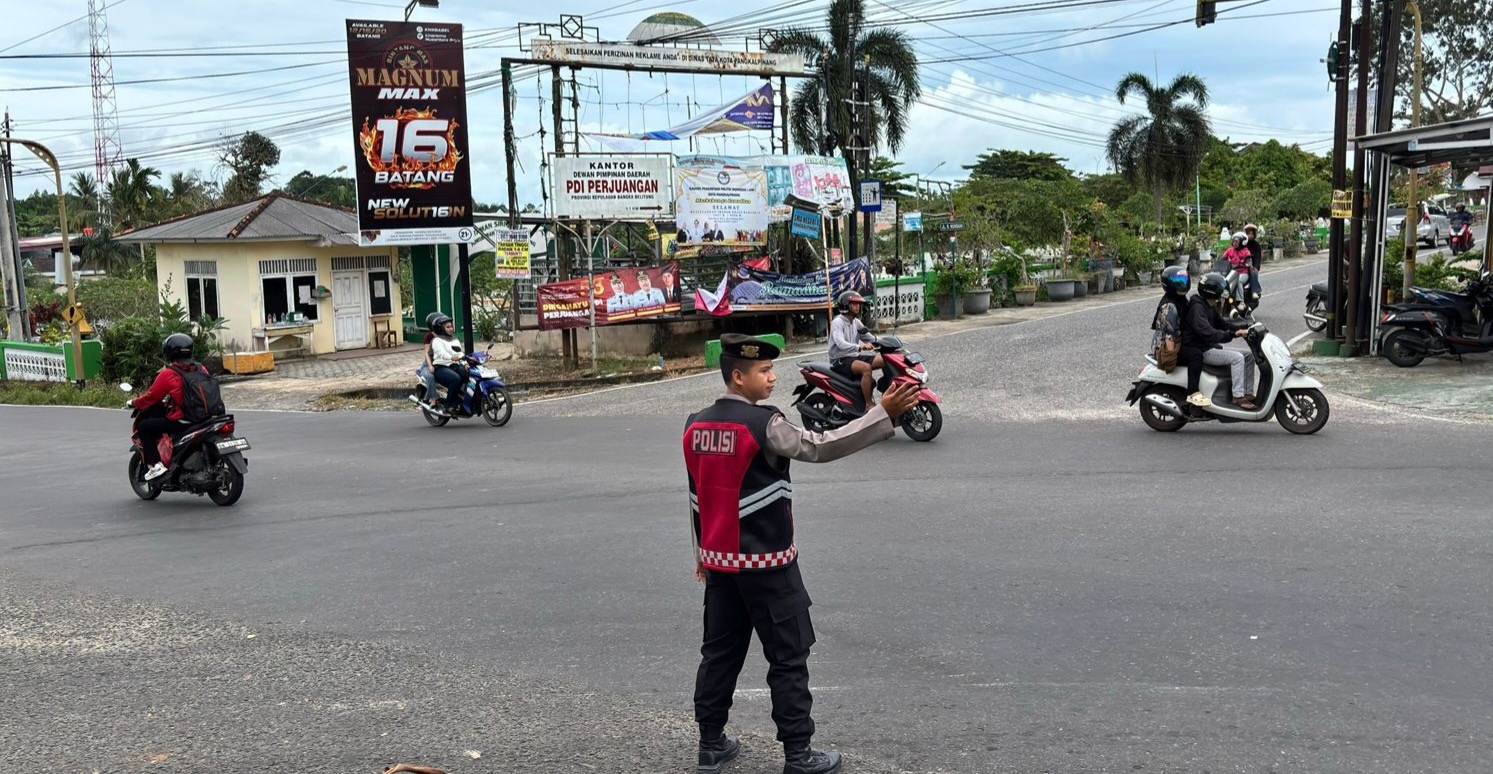 Untuk mengantisipasi kemacetan, personel Samapta dari Polresta Pangkalpinang dikerahkan melakukan pengaturan lalu lintas di titik-titik yang ramai aktivitas masyarakat.
