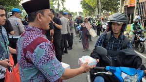 Kemudian pada sore hari, kegiatan dilanjutkan dengan pembagian takjil kepada masyarakat dan para pengemudi ojol yang melintas.