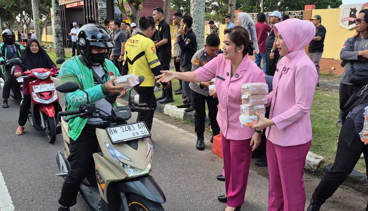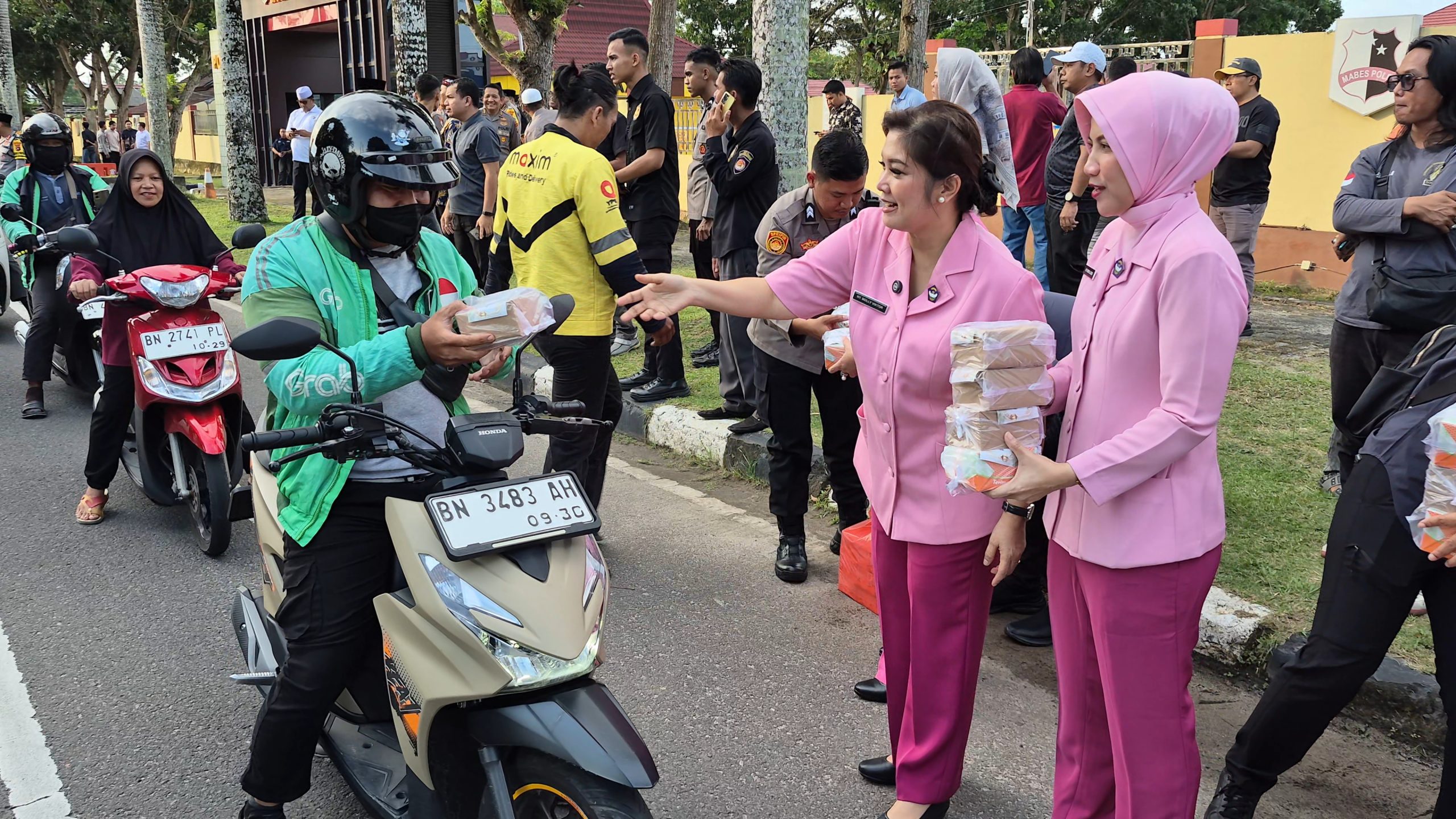 Sebanyak 1.300 paket takjil dibagikan langsung kepada masyarakat yang melintas di sekitar Mapolda Babel serta para pengemudi ojol yang sedang beraktivitas menjelang waktu berbuka puasa.