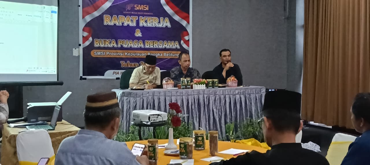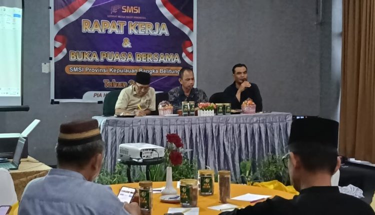PANGKALPINANG — Serikat Media Siber Indonesia (SMSI) Provinsi Kepulauan Bangka Belitung menggelar rapat kerja sekaligus buka puasa bersama pada Ramadan 1447 Hijriah/2026. Kegiatan tersebut berlangsung di Hotel PIA, Jumat (13/3/2026).