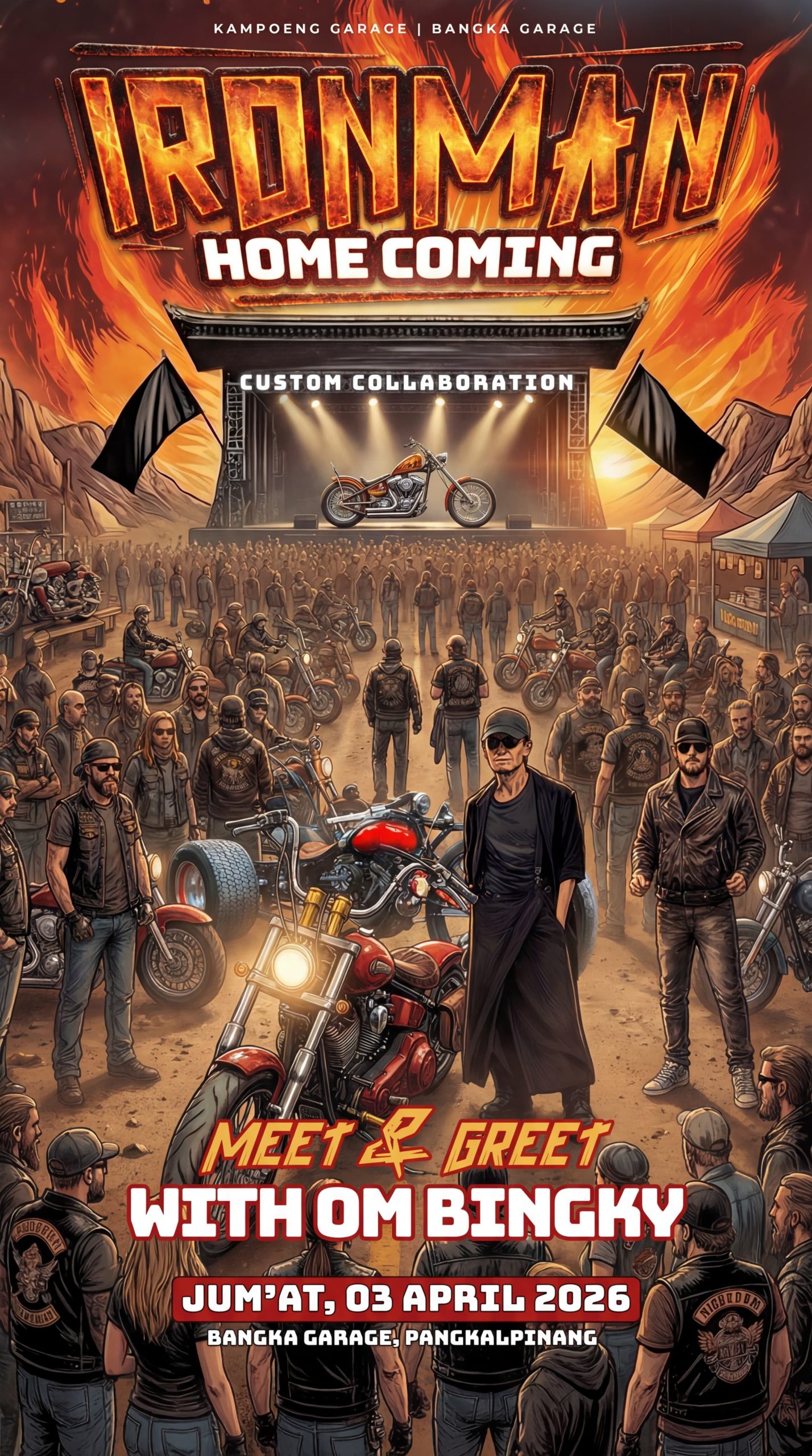 Acara ini merupakan hasil kolaborasi antara Kampoeng Garage 86 (Bangka Garage) dengan Biker’s Station (Carburator Springs) serta menghadirkan petinggi ICS (Indonesia Custom Show), yang selama ini dikenal sebagai salah satu platform terbesar dalam memajukan industri motor kustom di Tanah Air. Kehadiran Bingky dipastikan menjadi magnet utama, terutama bagi para pecinta motor kustom, builder, hingga komunitas biker di Bangka Belitung.